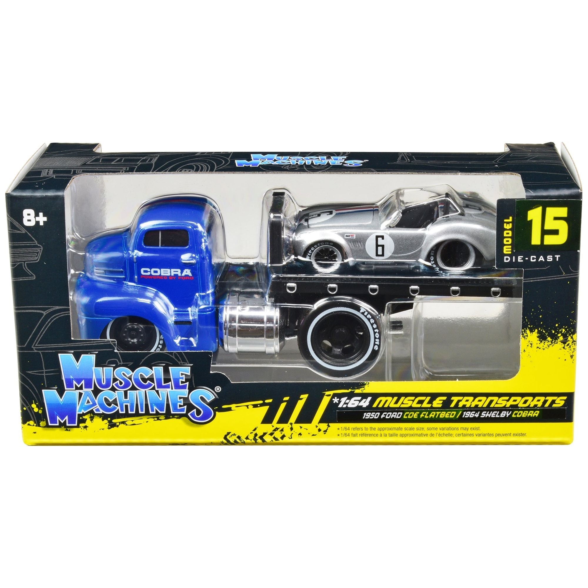 • Brand new 1/64 scale diecast models of 1950 Ford COE Flatbed Truck Blue "Cobra Powered by Ford" and 1964 Shelby Cobra #6 Silver Metallic with Stripes "Muscle Transports" Series die cast models by Muscle Machines.