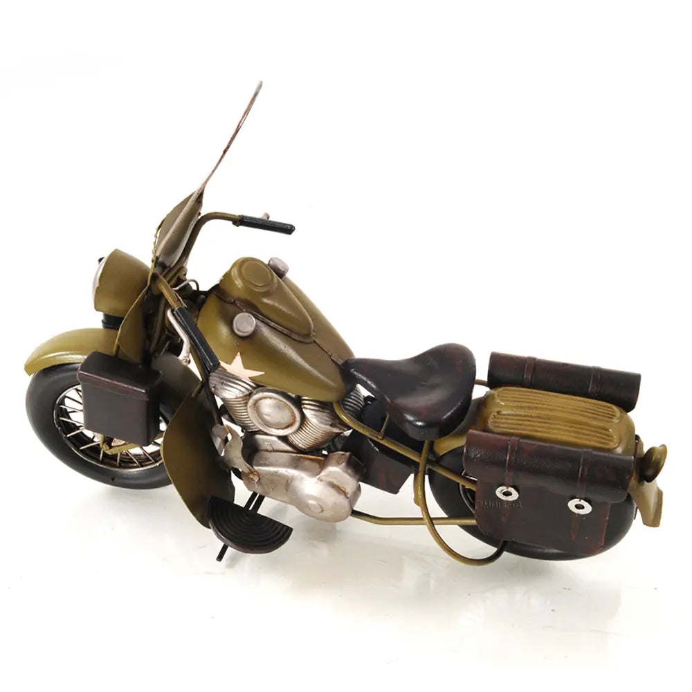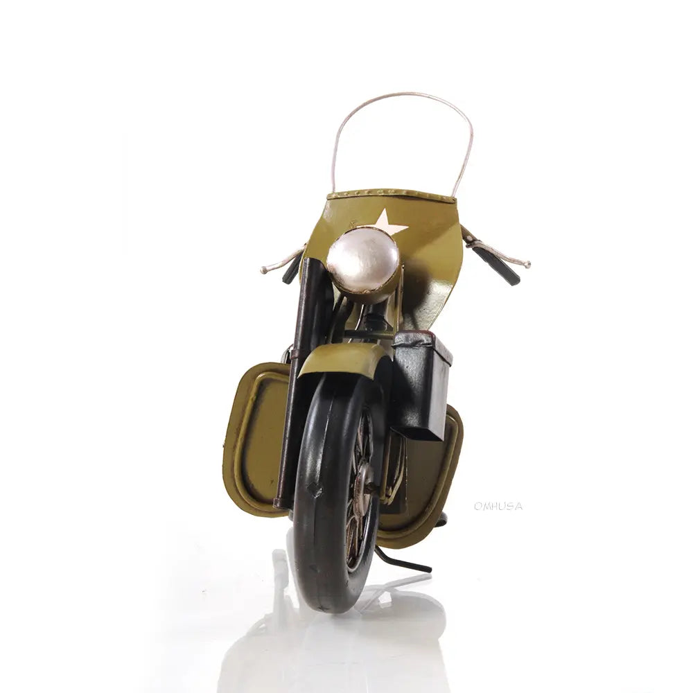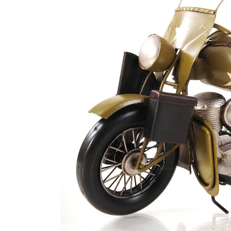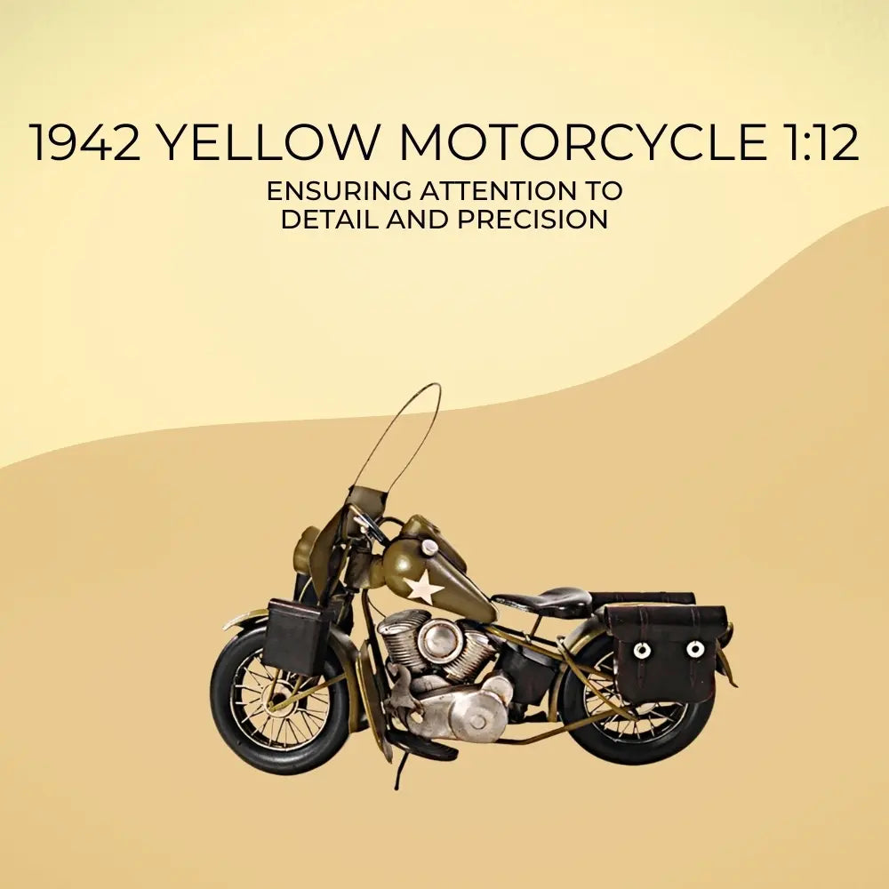 This 1942 model of motorcycle was produced to US Army specifications in the years during and around World War II. This vintage 1942 model was handcrafted of iron. It is painted yellow and has a scale of 1:12. It features intricate details such as spoke wheels, seat, light weight frame, pedals, storage compartment, and a wind screen. A must have for the collector and enthusiast!