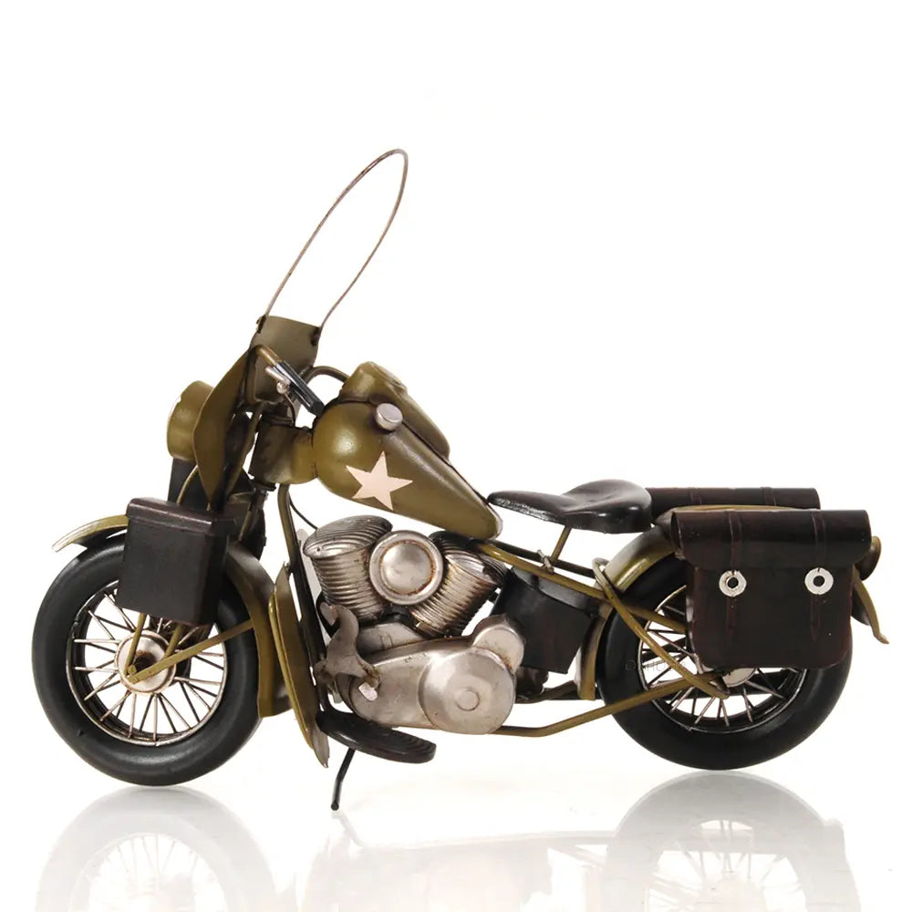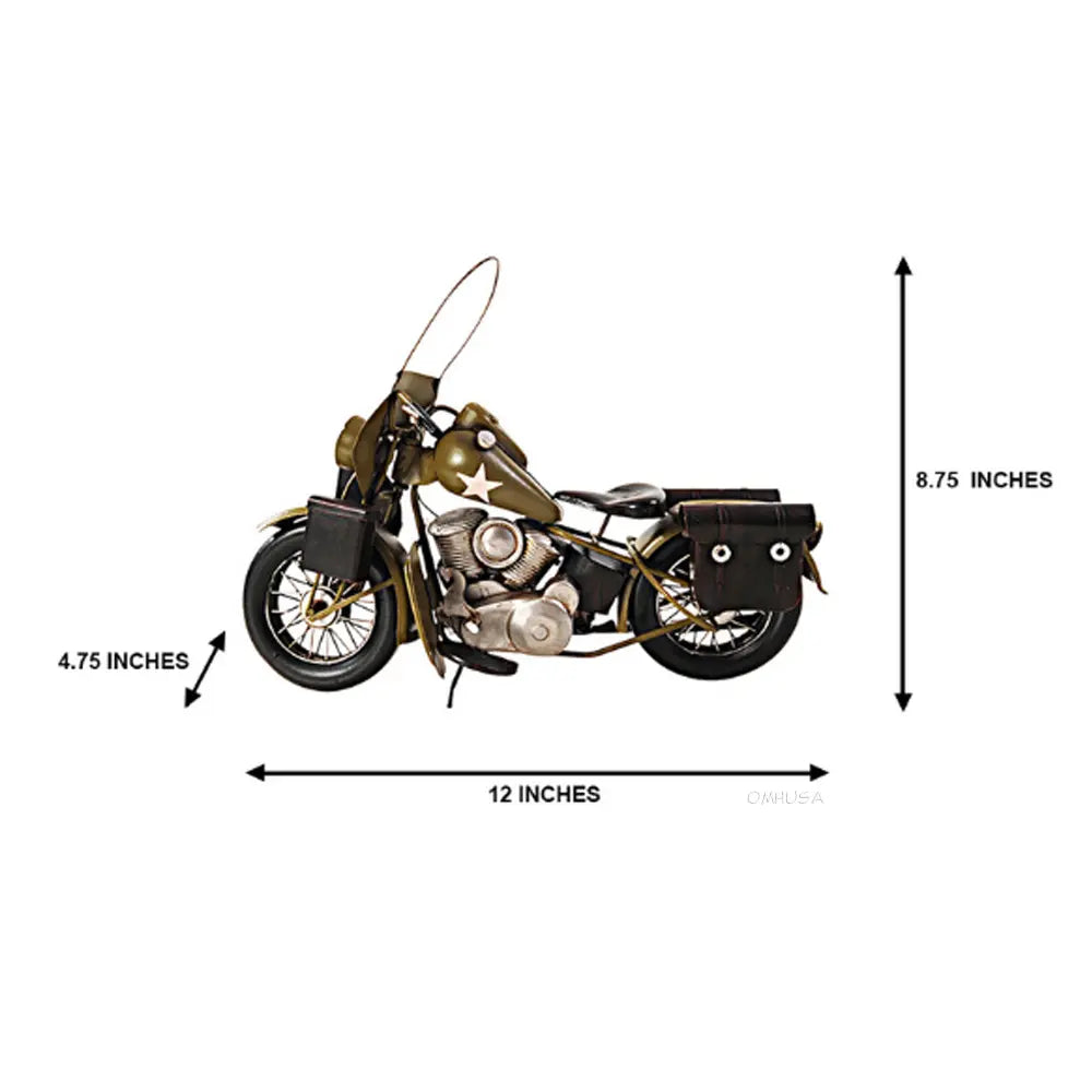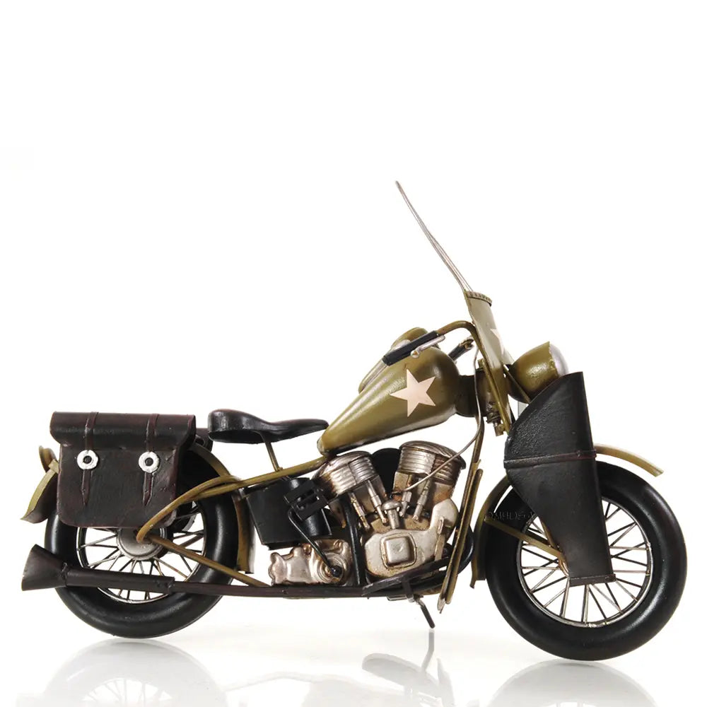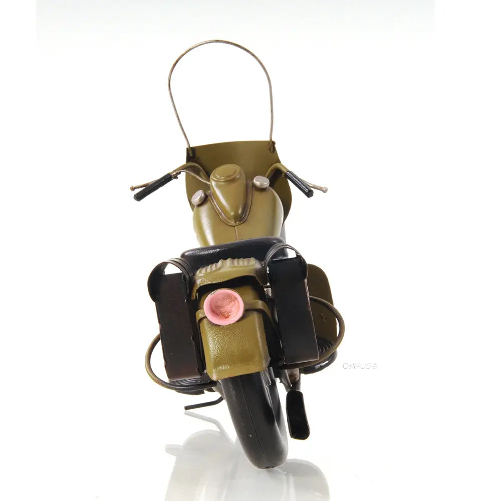 This 1942 model of motorcycle was produced to US Army specifications in the years during and around World War II. This vintage 1942 model was handcrafted of iron. It is painted yellow and has a scale of 1:12. It features intricate details such as spoke wheels, seat, light weight frame, pedals, storage compartment, and a wind screen. A must have for the collector and enthusiast!