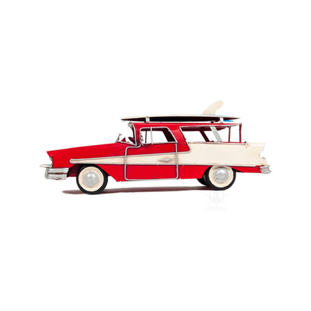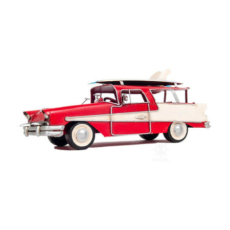 Travel back in time with this blue classic 1957 Ford Country Squire model, the best selling American-made wagon of its time. This model is handmade from iron and has a scale of 1:17. It features many intricate details such as fenders, wheels, front bumper, grills, license plate, roof rack, and a pair of surfboards. A perfect gift to display in your home or office! • 100% iron frame • Metal wheels • Wheels roll • Includes seats, steering wheel, and small details on the dash • Exterior details such as the surfboards are securely welded on Ford is a trademark of Ford Motor Company.