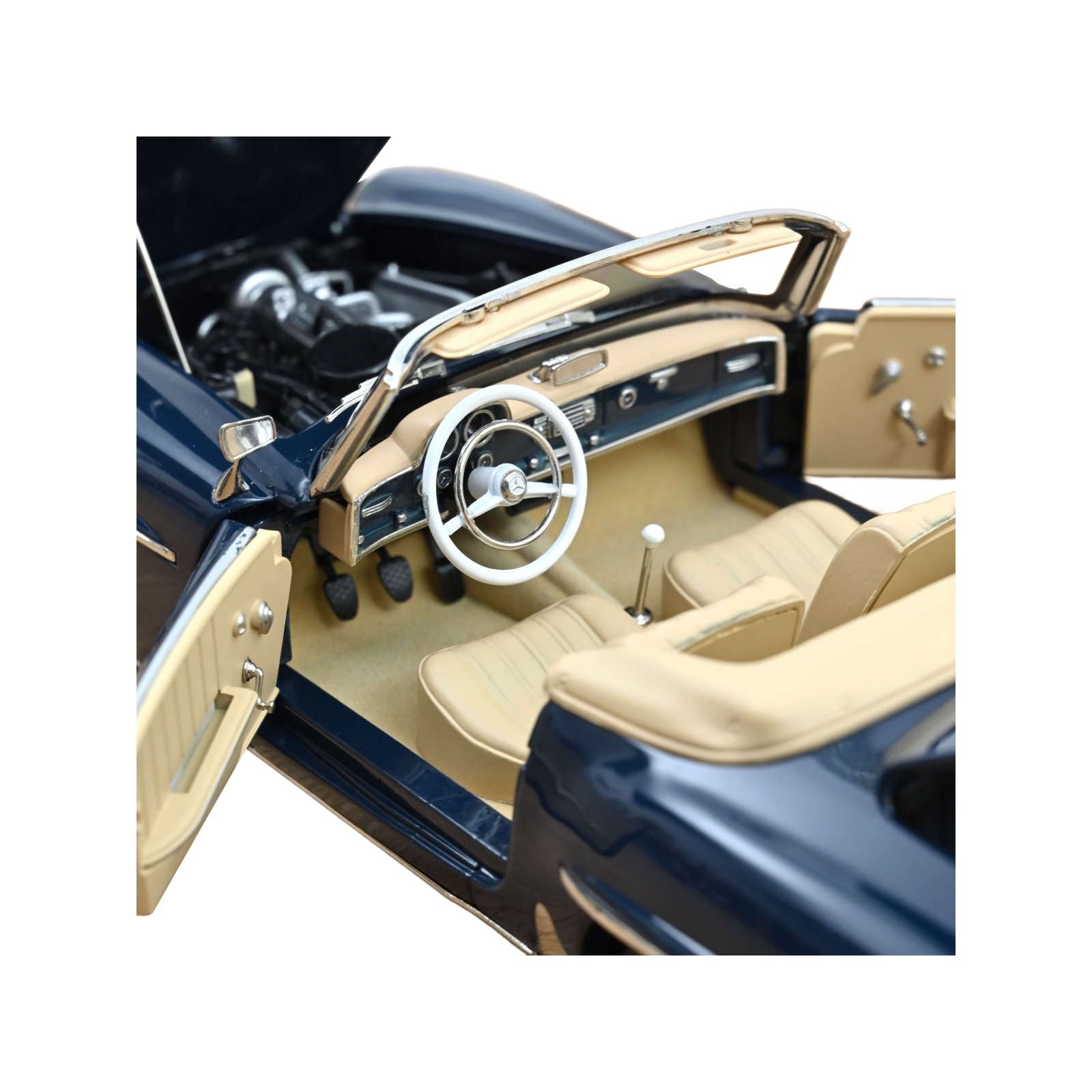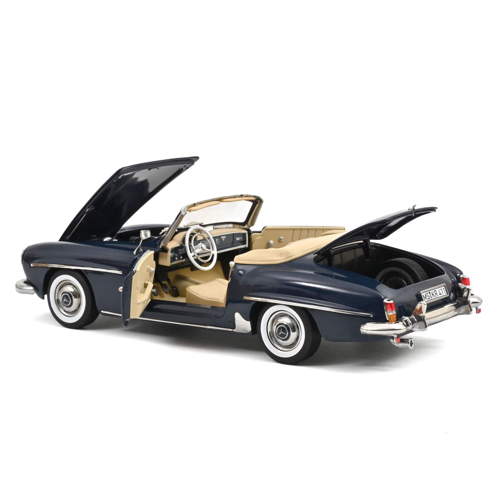- Brand new 1/18 scale diecast car model of 1957 Mercedes-Benz 190 SL Convertible Middle Blue with Black Top die cast model car by Norev.