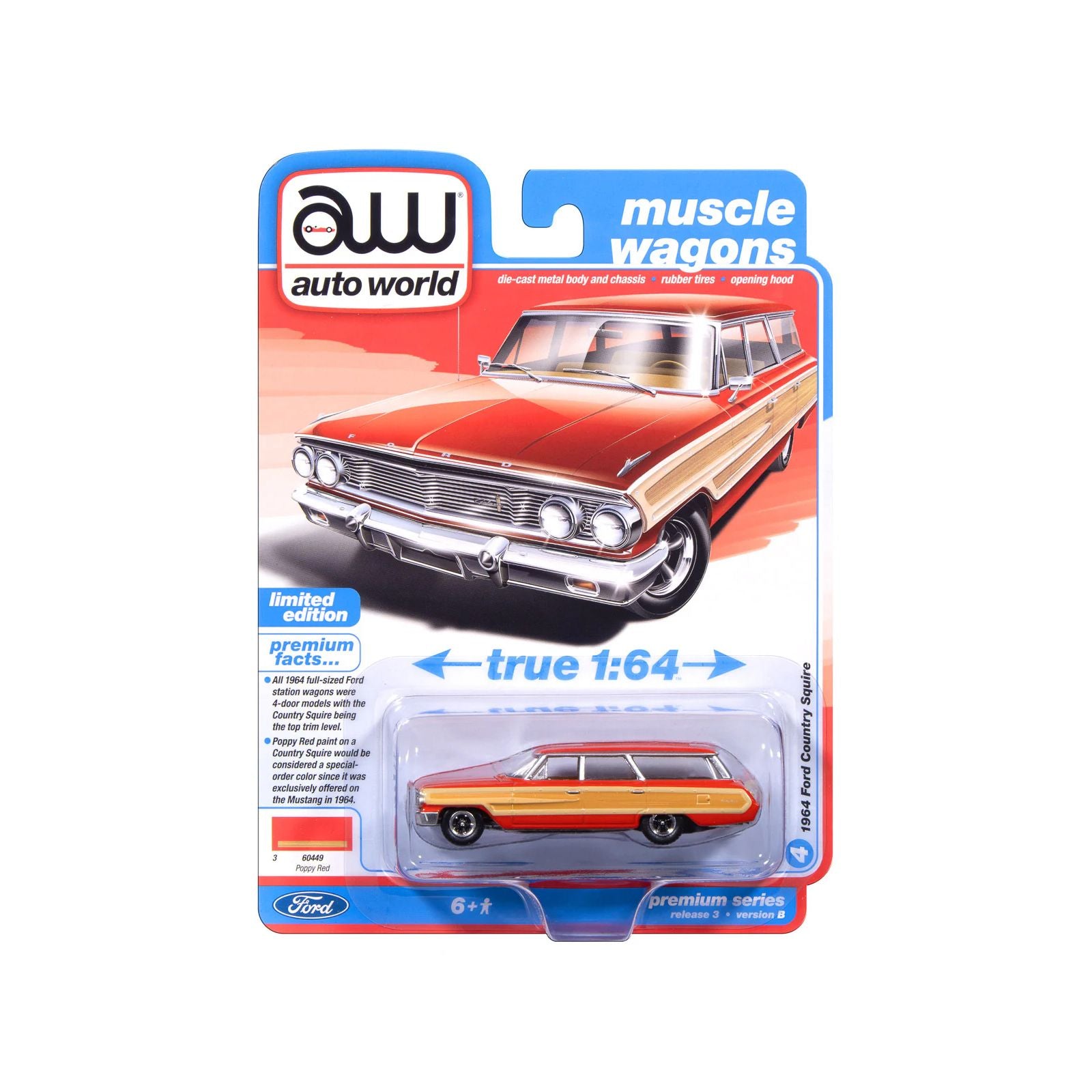 - Brand new 1/64 scale diecast car model of 1964 Ford Country Squire Poppy Red with Woodgrain Sides "Muscle Wagons" Series die cast model car by Auto World.