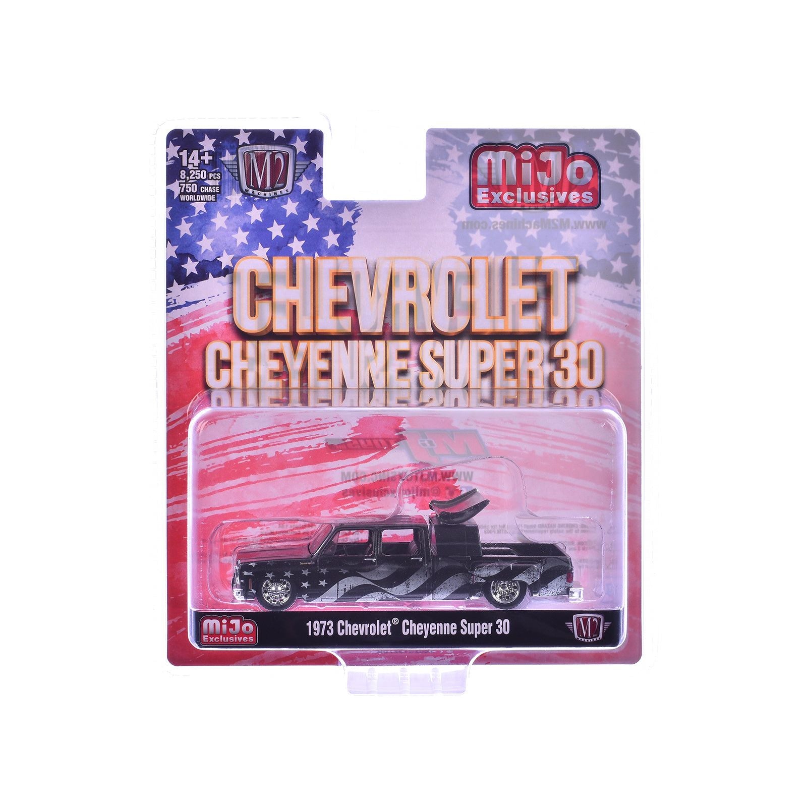 - Brand new 1/64 scale diecast car model of 1973 Chevrolet Cheyenne Super 30 Pickup Truck Black with American Flag Graphics Limited Edition to 8250 pieces Worldwide die cast model car by M2 Machines.