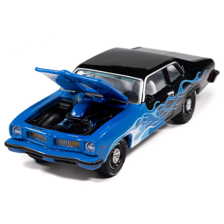 1974 Pontiac GTO Black and Blue with Blue Flame Graphics with White Interior "Black with Flames" Series 1/64 Diecast Model Car by Johnny Lightning