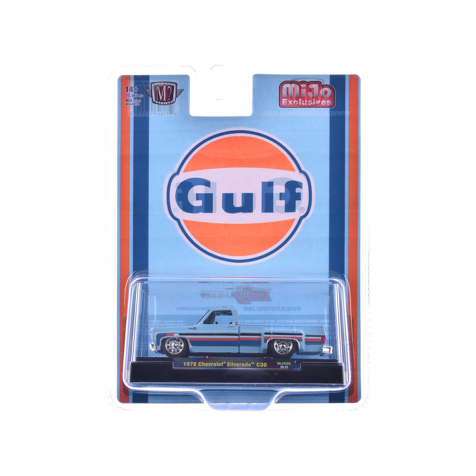 - Brand new 1/64 scale diecast car model of 1978 Chevrolet Silverado 30 Pickup Truck "Gulf Oil" Light Blue with Stripes Limited Edition to 10560 pieces Worldwide die cast model car by M2 Machines.