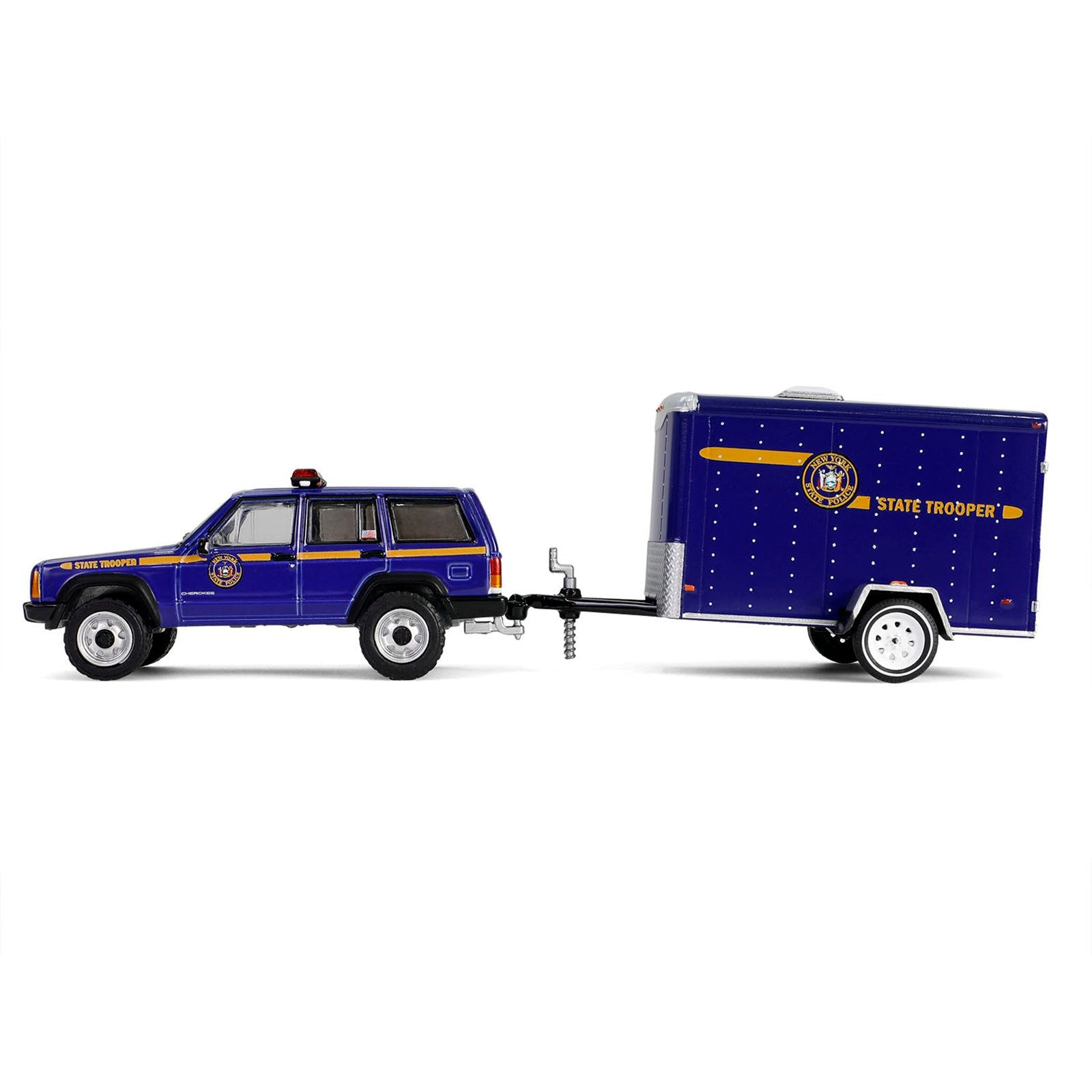 - Brand new 1/64 scale diecast car models of 2001 Jeep Cherokee "New York State Police" Blue with Yellow Stripes and Small Cargo Trailer "Hot Pursuit Hitch & Tow" Series 1 die cast model cars by Greenlight.