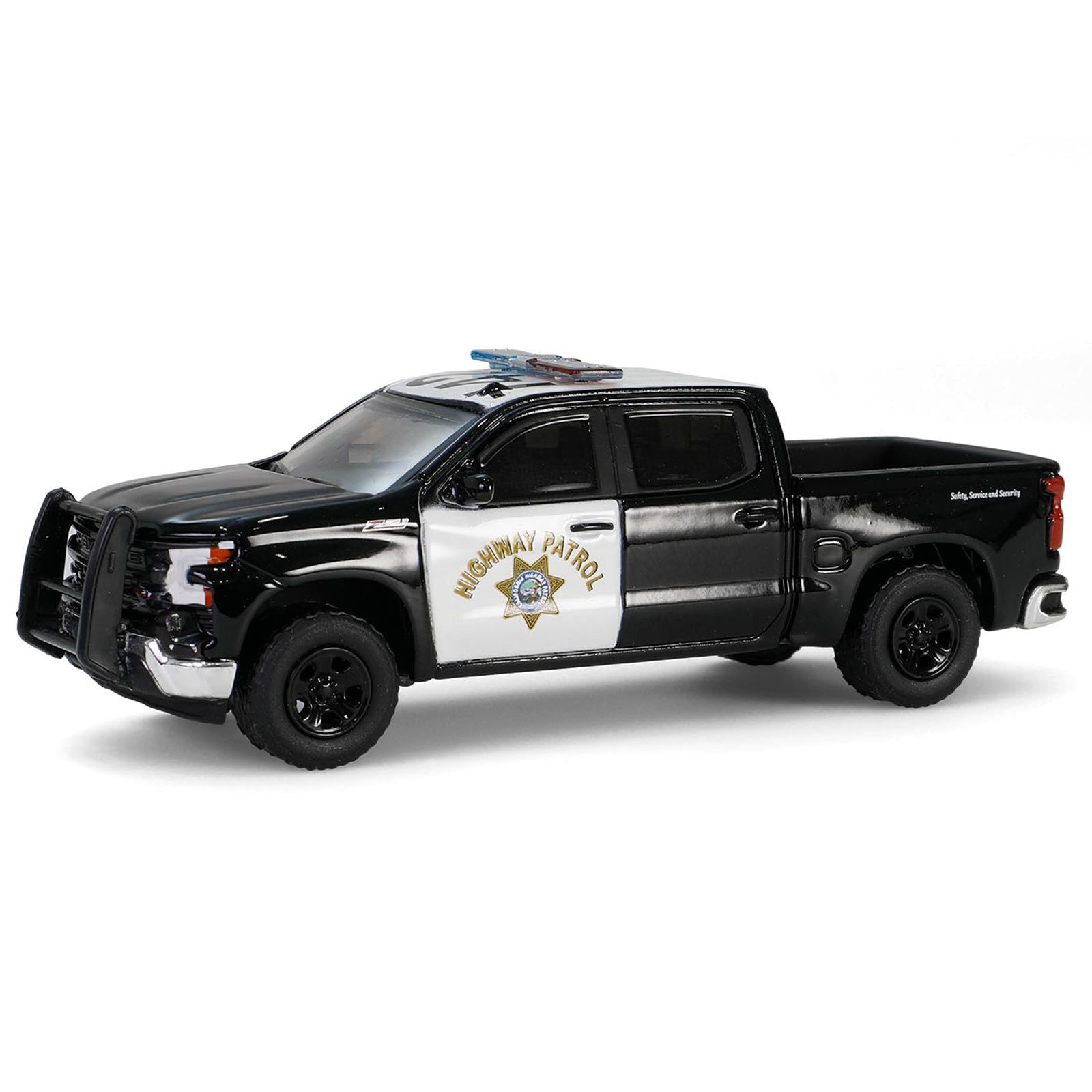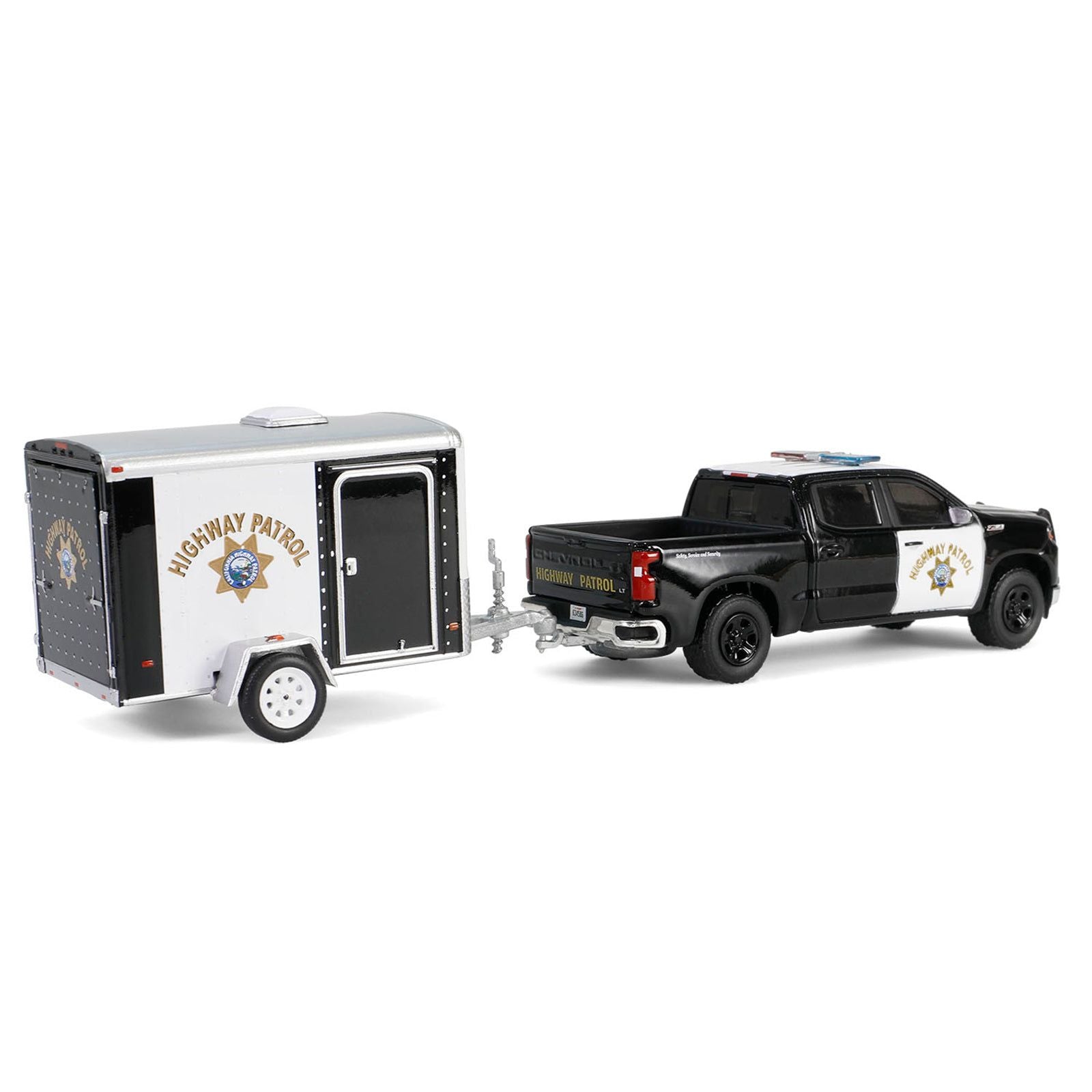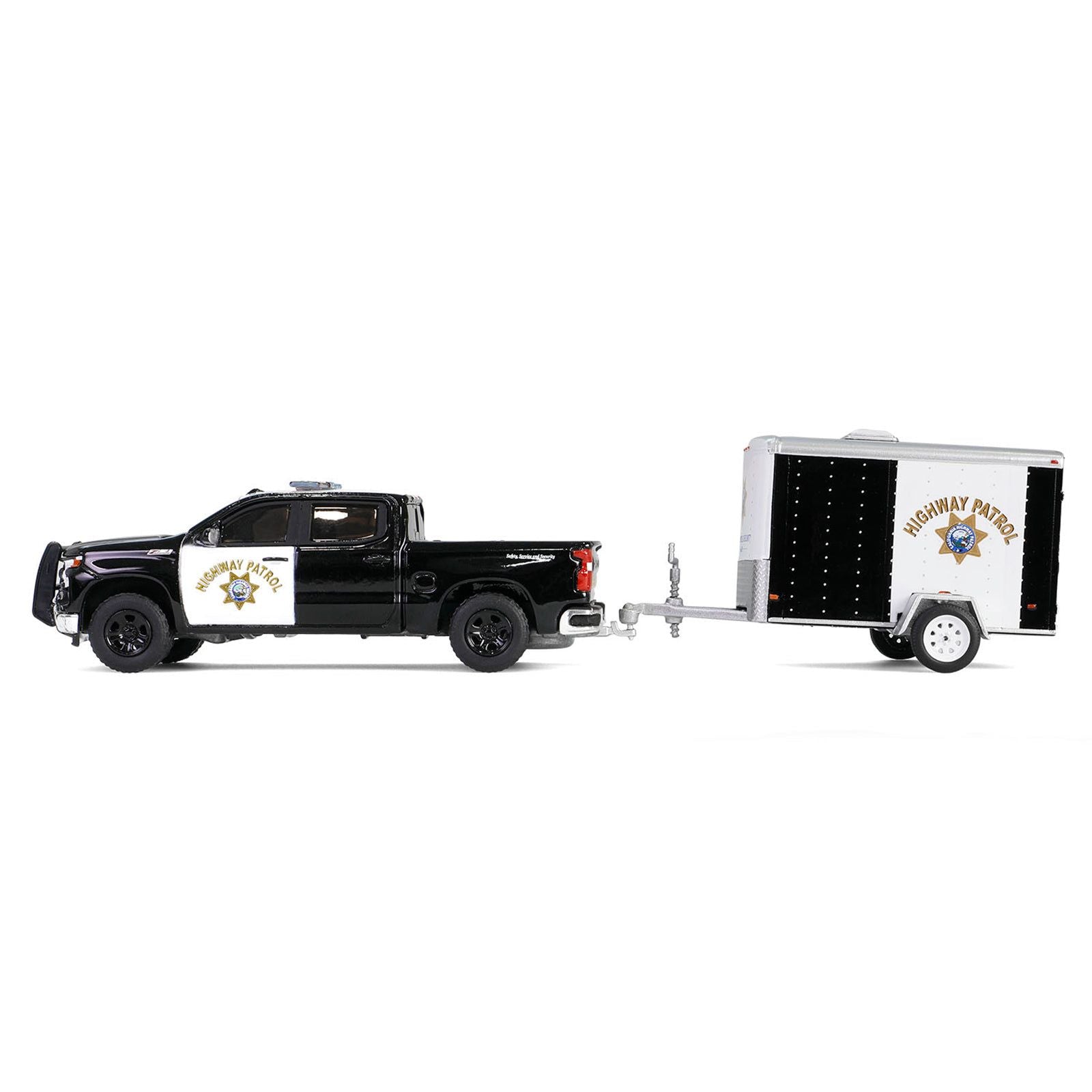 - Brand new 1/64 scale diecast car models of 2023 Chevrolet Silverado Pickup Truck "California Highway Patrol" Black and White with Small Cargo Trailer "Hot Pursuit Hitch & Tow" Series 1 die cast model cars by Greenlight.