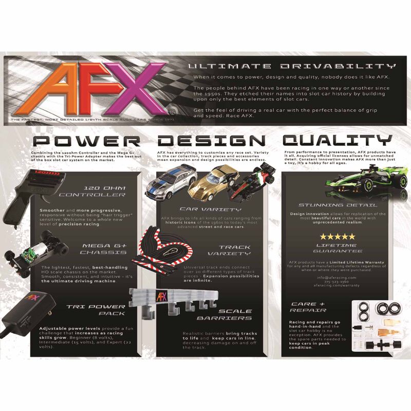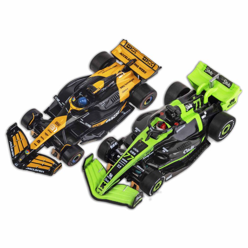 This officially licensed race set comes with finely tuned, incredibly detailed graphics on two of the most popular Formula One liveries of 2024. The McLaren F1 MCL38 driven by Oscar Piastri #81 goes up against the Sauber F1 C44 driven by Valtteri Bottas #77. Get the thrill of a real racing championship with 6 different track layouts complete with long straightaways, banked curves and speed traps. The race set comes with everything you need to race, including: 120 ohm controllers, 2 Mega G+ cars, the Tri Power Pack, tons of track pieces, spare car parts, and accessories to bring your track to life. New to the race? No problem. The AFX Tri Power Pack has multiple power settings so you can up the challenge as you master the skills of a world-class F1 driver. Prepare for the ultimate challenge. Will you be the next champion? Get in the race.
