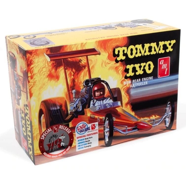 FEATURE PACKED: Tommy Ivo’s Rear-Engine Dragster is an iconic kit from the Kats at AMT! Fully paintable, with an expanded and improved sheet of water-slide decals with authentic markings. Features include a supercharged 426 HEMI® engine, airfoils, Deist drag chutes, super-slim dragster wheels, and big slicks with pad-printed lettering. The air-cheating body shell has been recreated from all new tooling and assembles more easily than before! Wrapped up nicely in eye-popping vintage AMT packaging! Includes a BONUS Original Art™ 9”x 6” mini print as a part of AMT’s Original Art Series!