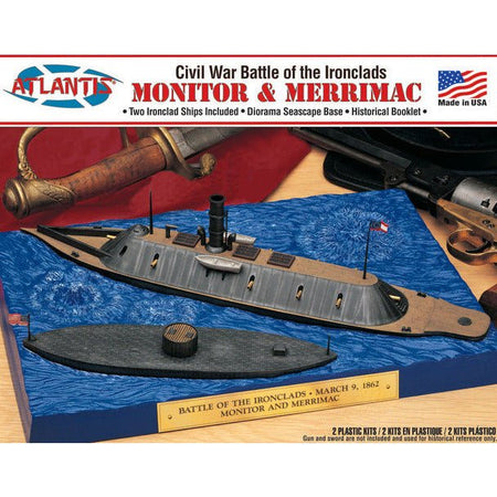 On March 9, 1862 a naval battle took place off the coast of Virginia that would forever change warfare at sea. This infamous battle is relived with Atlantis Models The Battle of the Ironclads historical diorama scene. This plastic model set comes with a historical booklet describing the Battle of Hampton Roads and the development of the first ironclad ships leading up to the faceoff. Perfect for a school project. The ships also come with their own individual display stands and nameplates. This great moment in history changed naval warfare forever and made every other navy in the world obsolete. It was an awesome and dangerous achievement in a sad and bitter war.