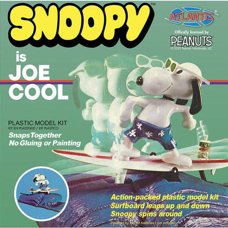 Snoopy is Joe Cool Motorized Snap Model kit. Gangway hodads! Heads up beach bums! Here comes the coolest hot-dogger to ever tame the waves. How cool? JOE COOL! Now you can build Snoopy as Joe Cool- his surfing alter-ego from the Peanuts comic strip, then watch him trick the tides. Awesome board leaps. Thrillin' 360s. He does it all and he does it in wild style. Ditch the glue and paint. Just snap him together, juice him up with battery power, then hang back and watch him do his stuff. Joe Cool is the coolest! This retro plastic model kit is back. Made from the original molds dating to 1973 it is sure to bring back some happy memories. Snaps together without any gluing or painting. Action packed model is battery powered. The surfboard bobs and Snoopy spins around. It is molded in 3 colors, blue, white and black so no painting is needed. Includes pre-wired motor and contacts. Includes easy to apply sticker sheet. Requires 2 AA batteries (not included). Measures 6 inches tall and 10 inches long! 28 parts. Officially licensed with Peanuts Worldwide LLC.