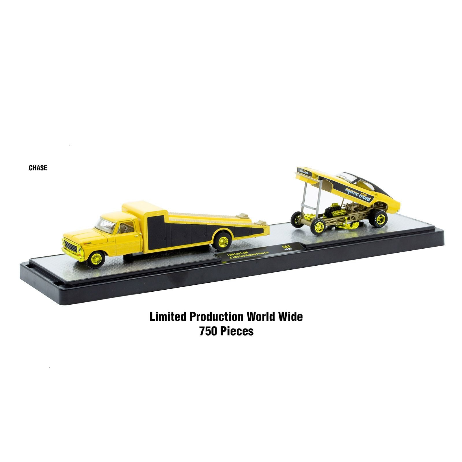 - CHASE B: 1969 Ford F-350 Ramp Truck. The body is yellow and black, the bumpers, trim and wheels are gold chrome, the interior is gold. 1969 Ford Mustang Funny Car. The body is yellow and black, the chassis is gold, the wheels and trim are gold chrome, the interior is gold. Limited Edition to 750 pieces Worldwide.