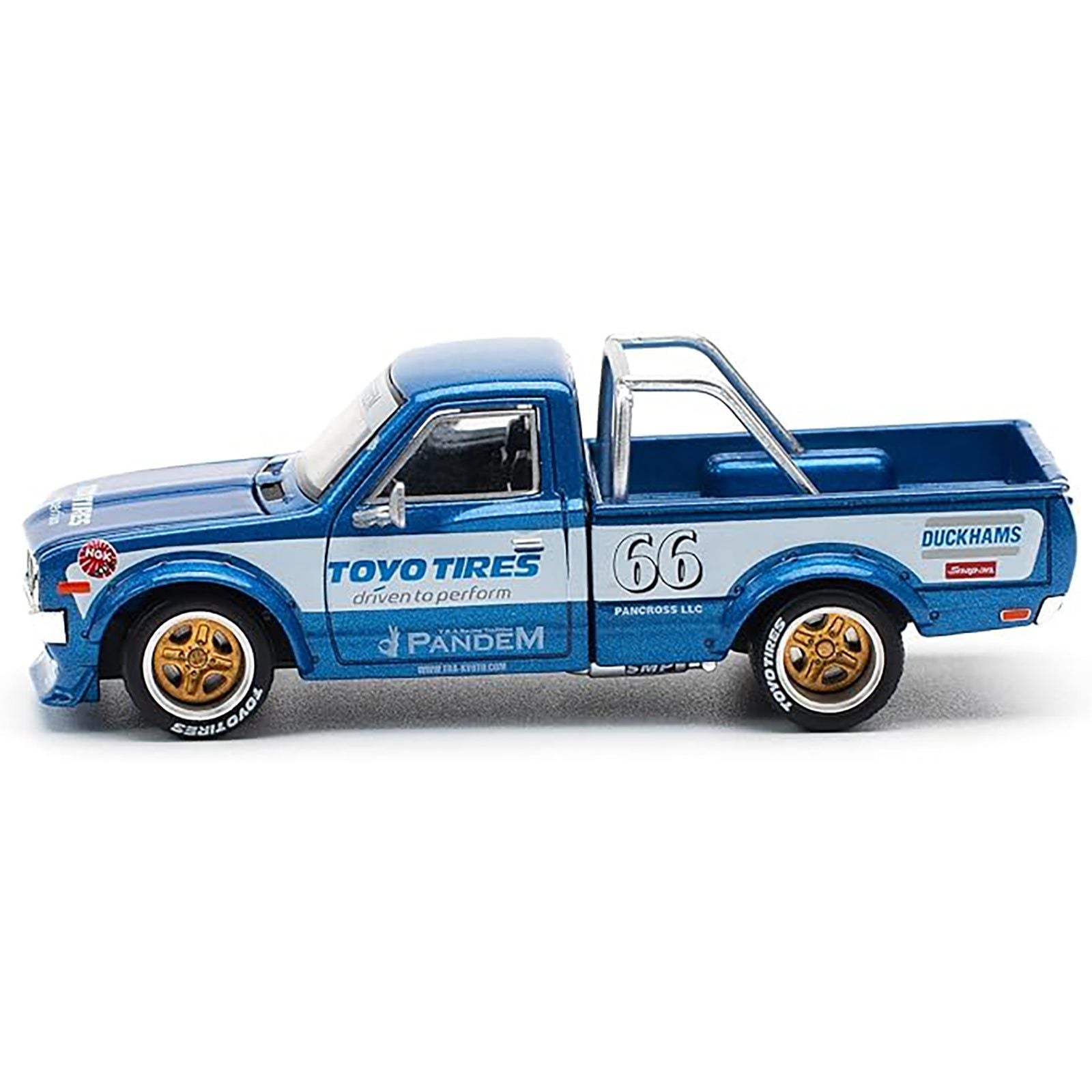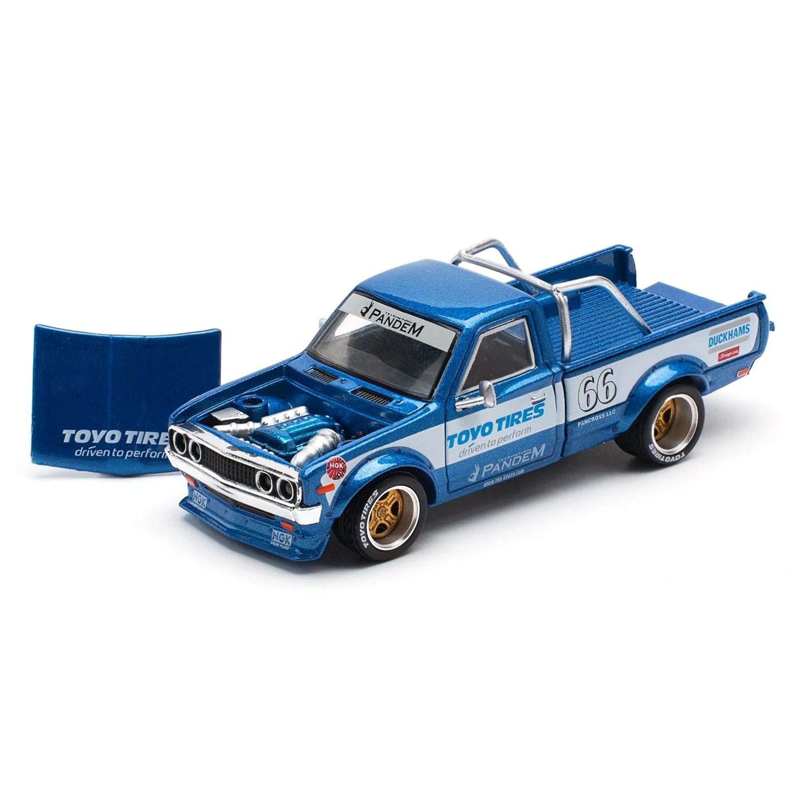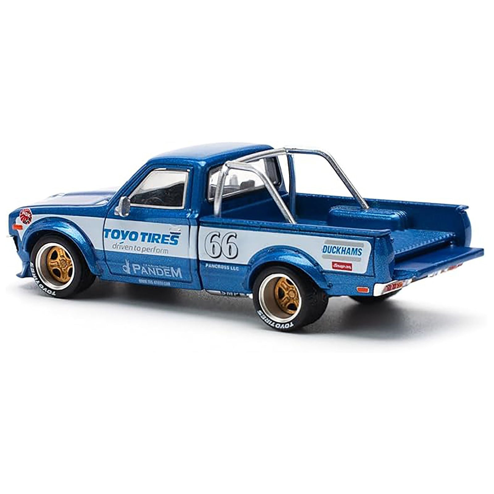 - Brand new 1/64 scale diecast car model of Datsun Pandem 620 Pickup Truck #66 Blue Metallic with White Stripes and Graphics die cast model car by Pop Race.