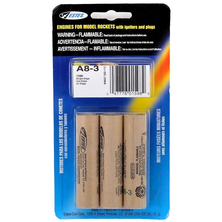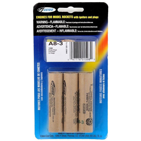The Estes A8-3 engine is single stage engine designed for model rocket flight. This engine is a standard engine designed for flights in rockets weighing less than 3 ounces, including the engine. Each package includes 3 engines, 4 starters and 4 starter plugs.