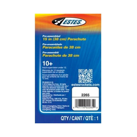 This is a 15 Plastic Parachute for Model Rockets from Estes. Suitable for Ages 10 Older with Adult Supervision for Those Under 12. COMMENTS: Due to small parts that could cause a choking hazard please keep For your safety and enjoyment, always follow the NAR Model Rocketry Safety Code while participating in any model rocketry activities tlc 12/5/12 updated tlc 1/10/13