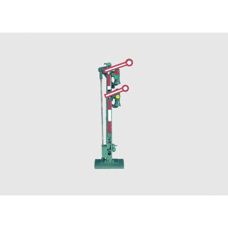 Below-Baseboard Mechanism. Slow Motion Semaphore Movement. 2 aspects "Stop" (Hp0) and "Proceed Slowly" (Hp2). 2 coupled semaphore arms, with LED lighting, and below-baseboard mechanism permanently attached to the signal. Height 48 mm / 1-7/8". Installation depth 65 mm / 2-9/16", diameter of mounting hole 13 mm / 1/2".