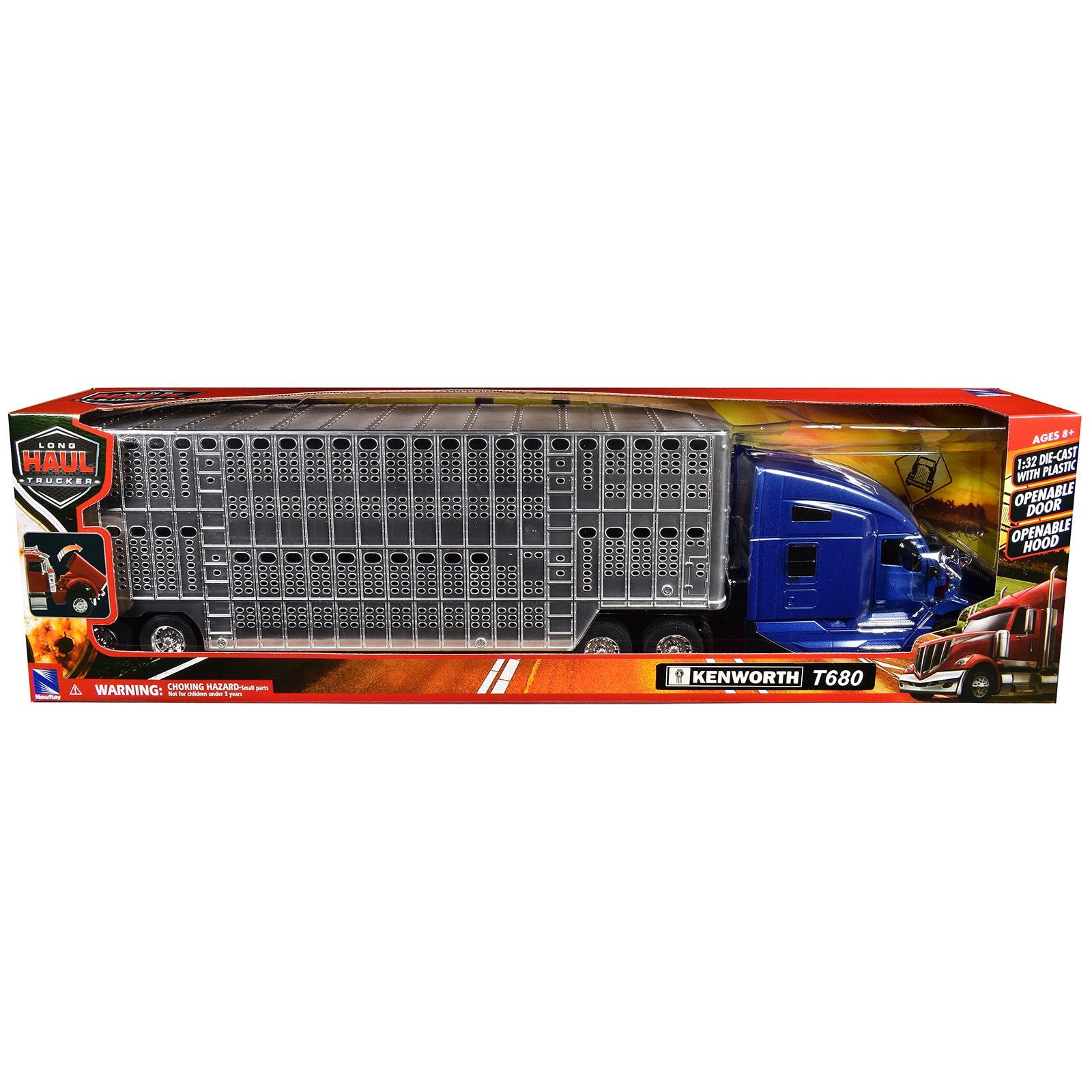 - Brand new 1/32 scale diecast model of Kenworth T680 Truck Blue Metallic with Livestock Trailer Chrome "Long Haul Trucker" Series die cast model by New Ray.