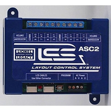 CONTROLER Add more functionality with Optional Add-on Component of the Layout Control System. The ASC2 can be configured toswitch mode" or two types ofaccessory mode" operation. Features When configured in switch mode, an ASC 2 operates up to four remotely operated switches from Lionel and other manufacturers. The ASC2 has eight Normally Open relays, with four banks of two complementary outputs. One pair of relays will activate the "THRU" position with one set of contacts, and the other set of contacts will activate the "OUT" position. Each relay is rated at 20 amps. The starting TMCC "SW" address (0-96) is user configurable and the next three switches are assigned the three subsequent IDs. When configured in accessory mode, up to eight lights, uncoupling tracks or basic on/off accessories can be controlled. Accessory mode is configured as 8 normally open relays, split into two banks of four. Each of these two banks has a common terminal feed. Two addressing schemes are supported in accessory mode. In "single address," the user sets a single TMCC "ACC" ID (0-99) for all eight relays. In operation, the user selects that ID, then hits numeric keypad 1-8. This will pulse the relay to that numbered-relay for one second, then shut off. This is ideal for uncoupling track activation. In "eight address" mode, the user sets a starting TMCC ACC ID for the first relay and the remaining seven are assigned subsequent TMCC IDs (up to ID 99 for the last relay). To operate, a given relay is addressed. Then, pressing the AUX1 key activates that relay as long as the key is held. AUX2 toggles the relay on or off, useful for operating lighting. The ASC2 can be operated from Lionel CAB remotes and/or the LCS App+LCS WiFi. In all operating modes, the ASC2 is connected to the LCS system using an LCS PDI cable. This carries commands as well as power for the ASC2's control electronics. An additional AC power source is required for relay operation