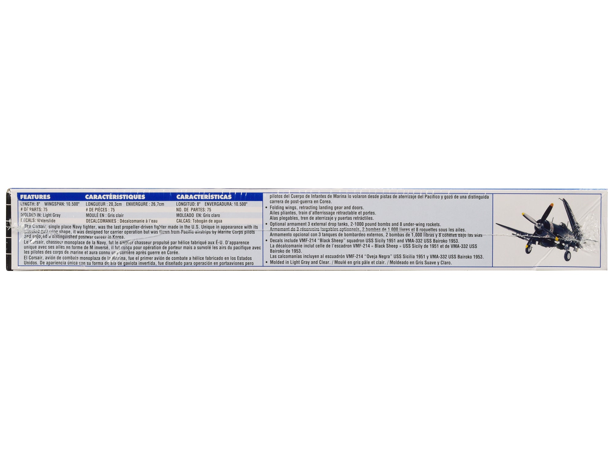 - Decals include VMF-214 "Black Sheep" squadron USS Sicily 1951 and VMA-332 USS Bairoko 1953.