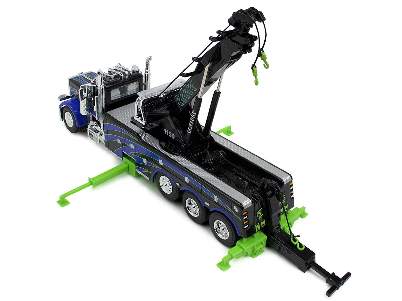 - Brand new 1/64 scale diecast model of Peterbilt 389 Day Cab with Miller Century 1150 Rotator Wrecker Tow Truck Black with Blue and Green Graphics die cast model by DCP/First Gear.