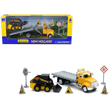 Peterbilt Roll-Off Flatbed Truck Yellow and New Holland L228 Skid Steer Yellow with Road Signs "New Holland Construction" Series 1/43 Diecast Model by New Ray