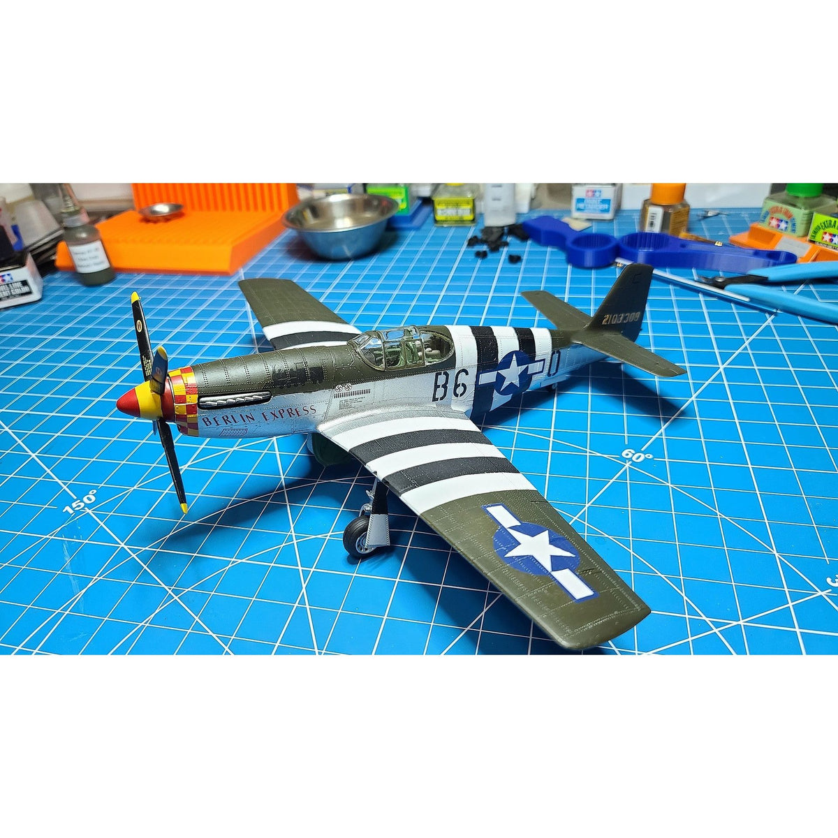North American Aviation designed the P-51 Mustang to fill a Lend-Lease order from the British. With their supercharged Rolls-Royce engines, these aircraft achieved incredible range and speed. Through hard fights and attrition they came to dominate the skies over Europe, escorting bomber groups into the heart of Nazi-occupied territory. They fought in every theatre of WWII and continued in service with dozens of countries for decades thereafter. Kit features a detailed V-12 engine, seated pilot figure, multi-part canopy, and decals for two versions.