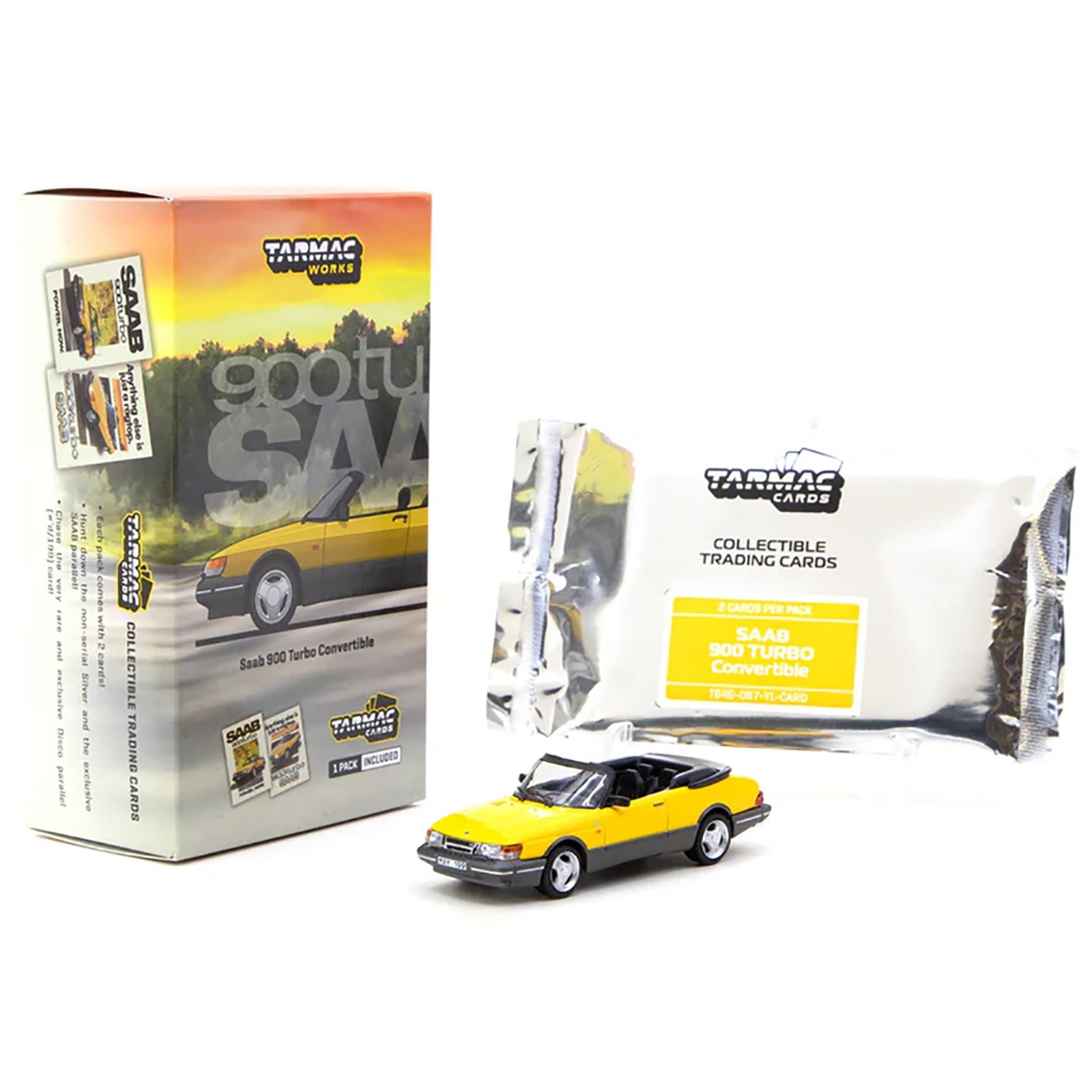 - Brand new 1/64 scale diecast model of Saab 900 Turbo Convertible Yellow with Tarmac Cards "Global64" Series die cast model by Tarmac Works.