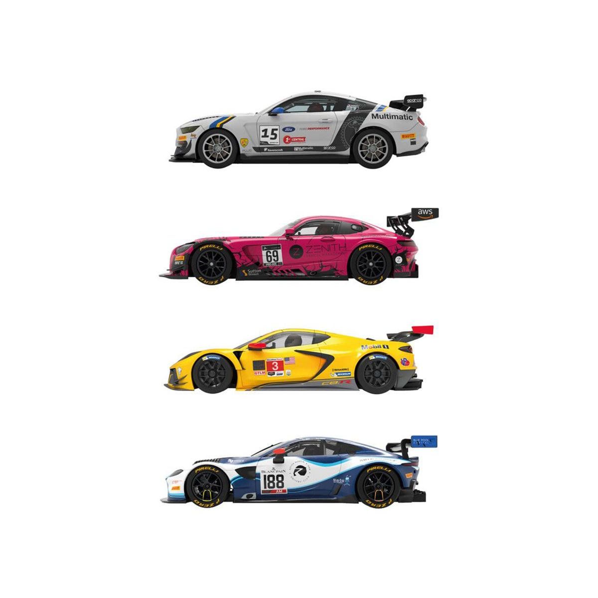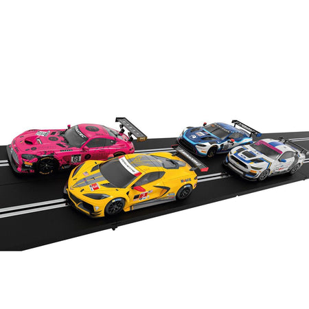 At the heart of this set is the revolutionary ARC PRO powerbase, allowing up to six cars to race at once with digital features such as lane changing, pit stops, and even simulated weather conditions. Players can monitor tire wear, fuel consumption, and braking systems while tracking real-time race stats through the app. This set includes over thirty feet of customizable track that builds up to eight unique layouts and includes barriers for realistic racing conditions. The included Aston Martin Vantage GT3, Mercedes-AMG GT3, Chevrolet Corvette C8.R, and Ford Mustang GT4 1/32 Slot Cars are each designed for speed and style, delivering a dynamic, immersive racing experience for enthusiasts and beginners alike.