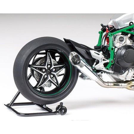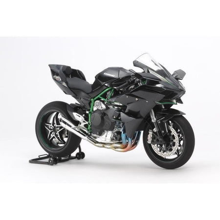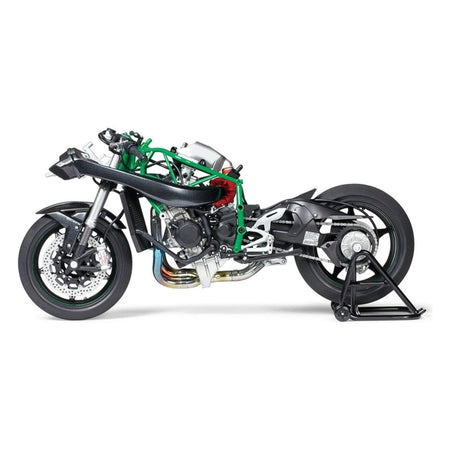 This 1/12 scale assembly model kit recreates Kawasaki's hyper-powerful Ninja H2R bike, a track-only monster that the famed Japanese manufacturer announced in 2015. The Ninja H2R was developed with input from many of the companies in the larger Kawasaki Heavy Industry group, and its name is a composite of two legendary Kawasaki bikes: the famed Ninja and the H2R. The Ninja H2R not only looks the part with a combination of bare carbon fiber and exquisite mirrored finish black chrome parts, it also has mind-blowing specs. It generates a hair-raising 300hp-plus from its supercharged 998cc inline-4, which it translates into other-worldly acceleration. It is also chock-full of up-to-date electronics for the track: traction control, engine brake control and more.