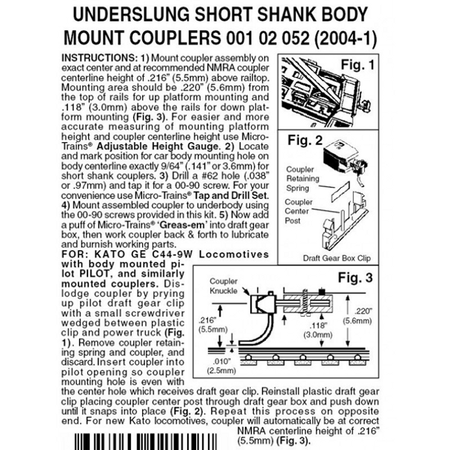 Assembled 2004-1 coupler. For new Kato locomotives, coupler will automatically be at correct NMRA centerline height of .216” 2 pr included.