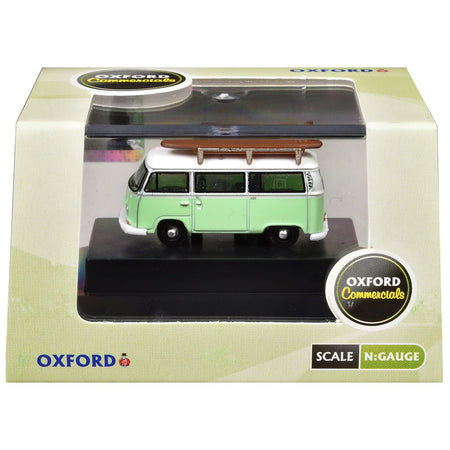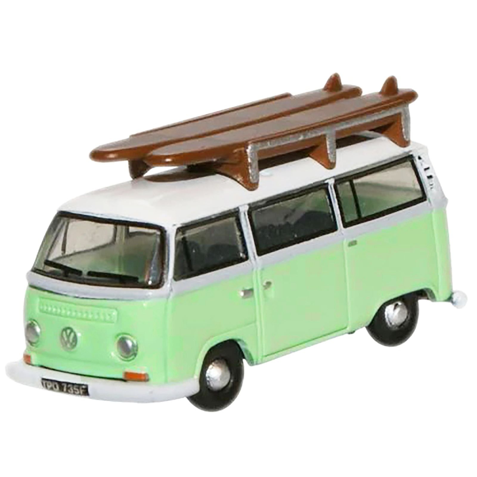 Volkswagen T2 Minibus Light Green and White with Surfboard on Roof Rack 1/148 (N) Scale Diecast Model Car by Oxford Diecast